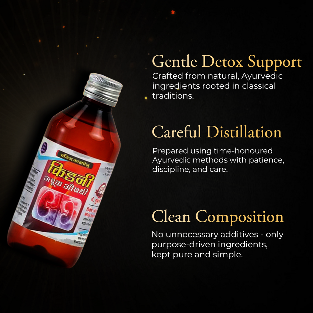 पारंपरिक आयुर्वेदिक सिद्धांतों से तैयार यह हर्बल अर्क गुर्दों की कार्यक्षमता, प्राकृतिक डिटॉक्स प्रक्रिया और मूत्र तंत्र संतुलन को प्राकृतिक रूप से समर्थन देने में सहायक है।