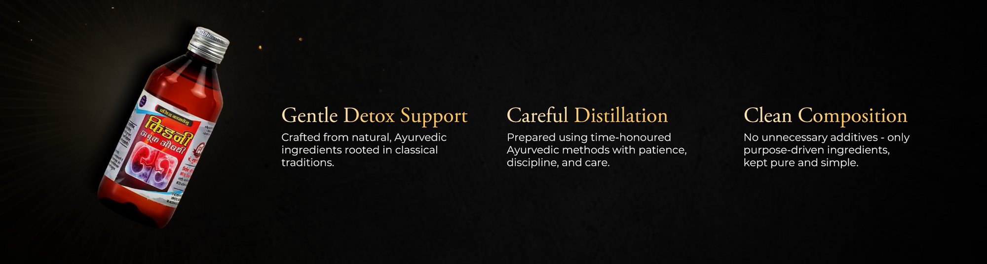 पारंपरिक आयुर्वेदिक अर्क निर्माण विधि का पूर्ण पालन - कोई जल्दबाज़ी नहीं, कोई कृत्रिम प्रक्रिया नहीं।