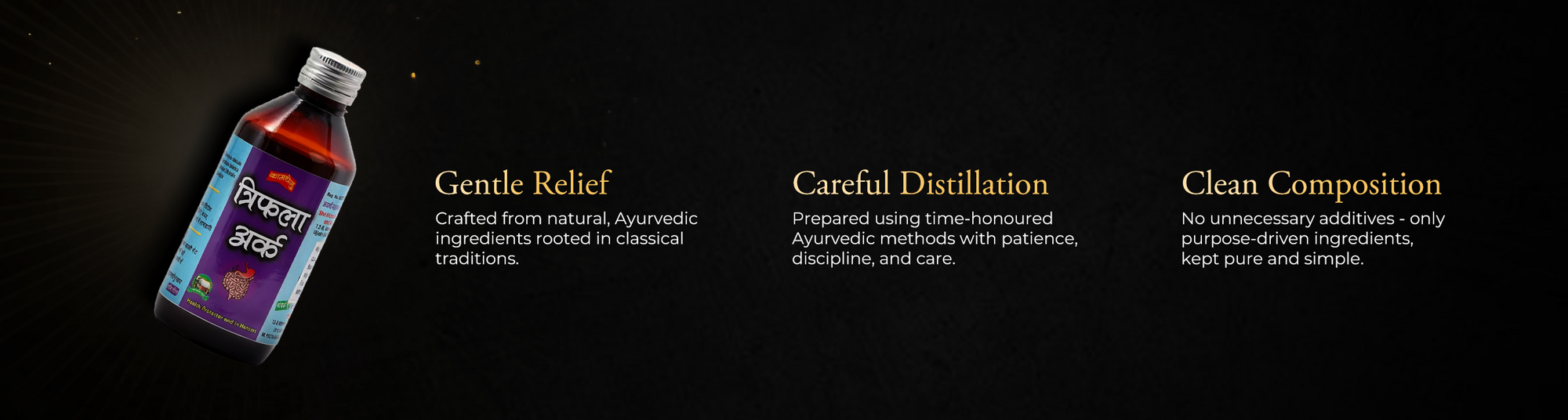 Trifla Ark is prepared following classical Ayurvedic ark formulation methods - nothing rushed, nothing artificial.
